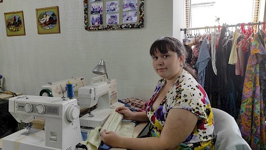 Nun nehmen ihre Träume Fahrt auf. Regelmäßig kommt Anja in die große Stadt, sitzt in unserer hellen Werkstatt, arbeitet mit wunderschönen Stoffen. Sie kann ihr Glück kaum fassen, dass unsere Mitarbeiterin Lena Grabenko ihr hilft und vieles beibringt.