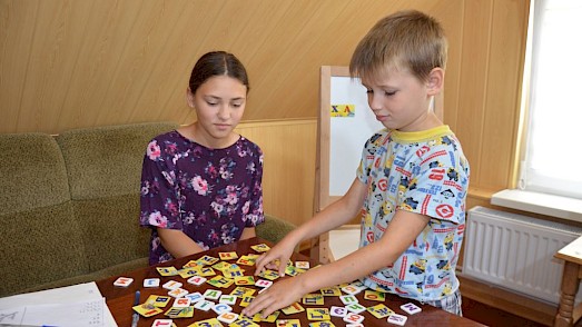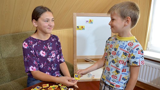 „Wo ist Tamara? Sie wollte mir doch zeigen, wie man eine 8 schreibt.“ Jegor konnte wegen des Krieges keinen Kindergarten besuchen. Er kommt aus einer großen Familie und seine Eltern haben ihn nicht auf die Schule vorbereitet. So wurde Tamara, eine Jugendliche aus unserem „Tageskinderheim am See“, seine Lehrerin. Sie hat Jegor beigebracht, wie die verschiedenen Farben heißen. Er weiß den Unterschied von klein und groß, kann einfache geometrische Figuren zeichnen. Tamara ist mit Begeisterung bei der Sache, kommt früh am Morgen, um sich auf den Unterricht vorzubereiten. „Ich fühle mich wie eine richtige Lehrerin!“, erzählt sie. Sicherlich werden ihr die Erfahrungen, die sie beim Unterrichten macht, später nützlich sein.