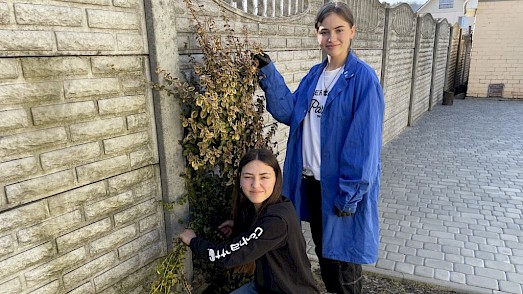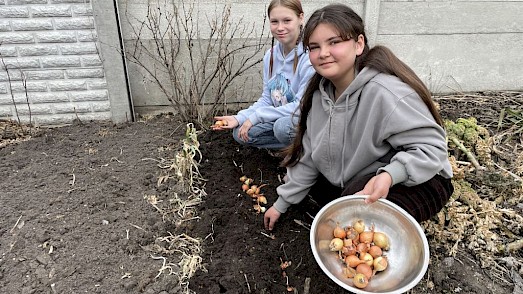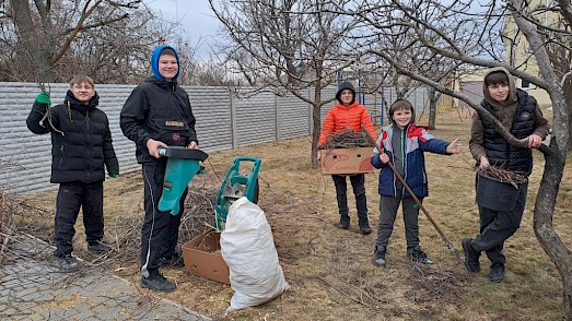 „Das ist ein schöner Strauch. Im Laufe des letzten Jahres ist er sehr dicht gewachsen. Ich schneide mit der Heckenschere die überflüssigen Zweige heraus. Dann wird er wieder besser wachsen“, meint Sonja zu Tamara. Unsere älteren Kinder arbeiten im Garten und im Blumenbeet. „Können wir die Zwiebeln und den Knoblauch pflanzen?“, fragt Lisa. Sie wohnt in einer Wohnung in der Stadt und interessiert sich trotzdem dafür, wie und was gepflanzt wird und wie es keimt. Nach dem Beschneiden der Obstbäume sammeln Jura, Maxim und Jegor viele Äste auf. Mit dem Gartenhäcksler werden diese zerkleinert. Die Arbeit schweißt die Kinder zusammen.