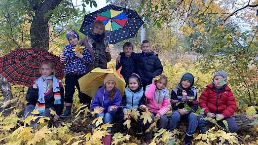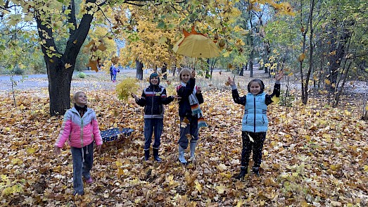 Die Kinder wurden langsam munter. Einige warfen mit Blättern, andere sammelten sie. Miroslawa klebte sich zwei Ahornsamen auf die Wange und rief: „Ich bin eine Fee!“