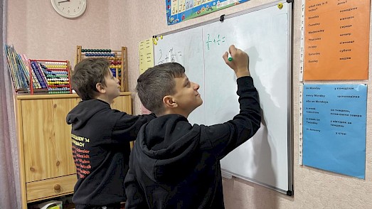 „Ich habe diese Aufgabe schneller gelöst als Jura!“, prahlt Maxim. Die beiden Jungen haben einen Mathematikwettbewerb veranstaltet.