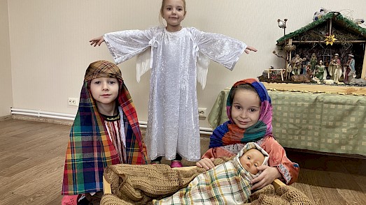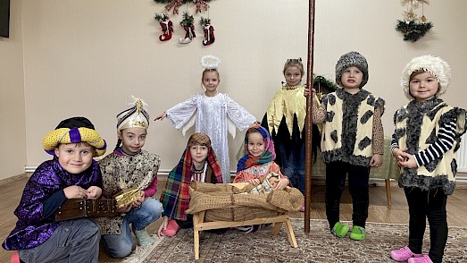 Wir haben zusammen die Weihnachtsgeschichte gelesen. Später durften sich die Jungen und Mädchen verkleiden. Maria hielt stolz eine Puppe in ihren Armen, das neugeborene Jesuskind. Wir spielten die Geschichte nach. Dazu hörten wir Weihnachtsmusik und für einige Momente vergaßen die Kinder den Krieg und die Kampfflugzeuge, die über unsere Städte und Dörfer fliegen.