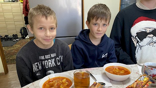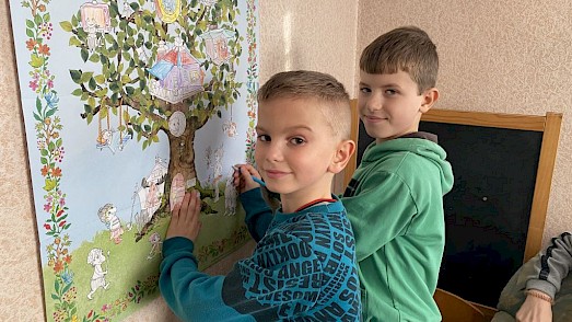 „Wir haben keinen Keller zu Hause. Wenn die Sirene heult, setze ich mich auf mein Bett. Die Fenster klappern von vorbeifliegenden Raketen, ich habe Angst, kann nichts tun. Besonders nachts ist es schlimm. Hier im Zufluchtsort können wir in den Schutzraum gehen“, erzählt der 9-jährige Sergij. Viele Kinder, die den Zufluchtsort in Boschedariwka besuchen, kommen aus armen Familien. Ständige Streitigkeiten, ein betrunkener Vater, kein Essen, Kälte – Dinge, die die Kinder stark belasten.