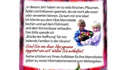 Im Frühjahr 2019 starteten wir ein neues Projekt „Marmelade hilft“. Eine Missionsfreundin erzählte uns freudestrahlend: „Mir kam da so eine Idee: In diesem Jahr haben wir so viel Obst geerntet. Ich könnte daraus Marmelade kochen und auf dem Flohmarkt und Kirchenbasar verkaufen. Den Erlös spende ich Ihnen für notleidende Familien in der Ukraine!“