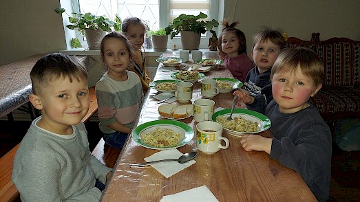 In unseren Kinderhäusern gibt es jeden Wochentag ein warmes Mittagessen für unsere Gäste. Unsere Mitarbeiter erstellen einen Menüplan, wenn möglich, nach den Wünschen der Kinder. Sie gehen einkaufen und bereiten die Lieblingssuppen und Gerichte zu. Dazu gibt es warmen Tee und manchmal auch selbst gebackenen Kuchen. Die Teller sind in der Regel schnell geleert. „Tante Luba, heute schmeckt das Essen wieder soo lecker! Kann ich bitte noch ein bisschen mehr Suppe bekommen?“