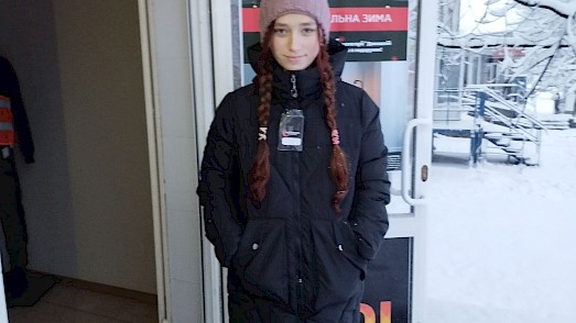 Anja betrachtet sich im Spiegel. Sie trug die alte Jacke ihrer Mutter. Jetzt hat sie eine neue bekommen. „Ich freue mich, dass ich nun eine so bequeme eigene Jacke habe,“ sagt sie glücklich.