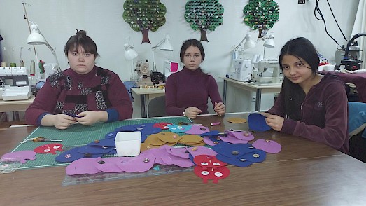 Unsere Mädchen in der Lehrwerkstatt sind klasse! Sie bekamen die Aufgabe, ein Lernspiel für unsere Kleinen im Spatzennest zu entwickeln. Mit viel Geduld gestalteten sie eine Raupe, die aus verschiedenen Kreisen besteht, die mit großen Knöpfen verbunden sind. Das Annähen der Knöpfe dauerte einige Zeit.