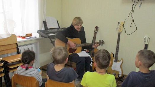 Der Krieg prägt das Spiel der Jungen. Trotzdem versuchen unsere Erzieherinnen Hoffnung zu verbreiten. Sie hören zu, umarmen die Kinder, essen zusammen, singen Lieder mit ihnen.