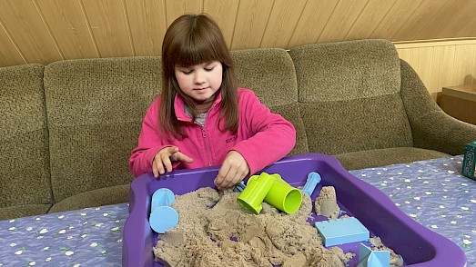 „Mein Fisch wird sich hier wohlfühlen“, erzählt Albina. In der Kunsttherapie geht es darum, eine sichere Umgebung zu schaffen. Jewa baut eine Stadt aus kinetischem Sand.