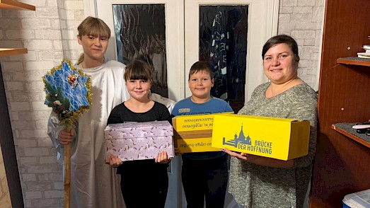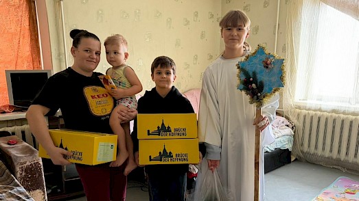 Unsere Jungen Missionare, begleitet von einem Engel mit leuchtendem Stern, wünschen den Familien gesegnete Weihnachten, bringen ihnen Hoffnungsboxen und Lebensmittelpakete. Fröhliche Weihnachtslieder, ein warmes Lächeln und Umarmungen verwandeln die Atmosphäre in eine festliche Stimmung. Die Freude und Dankbarkeit sind groß.