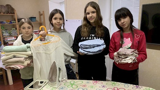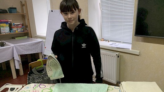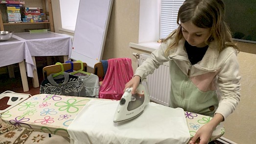 Rita füllt Wasser in das Bügeleisen, wartet, bis die Kontrollleuchte erlischt und beginnt, ein Geschirrtuch zu bügeln. „Ich weiß jetzt, was ich falsch gemacht habe“, sagt Nastja. Sie stellt den Regler des Bügeleisens herunter und bügelt eine weiße Bluse. Sie ist sehr stolz!